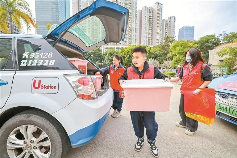 ▲“愛心年夜飯”大禮包抵達鹽田區(qū)行政文化中心廣場。 深圳晚報記者 李嫻 攝